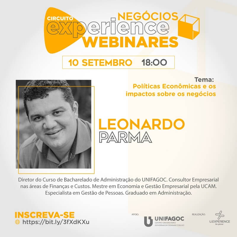 Leonardo que também é Consultor Empresarial nas áreas de Finanças e Custos, mestre em Economia e Gestão Empresarial e especialista em Gestão de Pessoas, irá ministrar uma palestra com o tema Políticas Econômicas e os Impactos sobre os Negócios no dia 10 de setembro (quinta-feira), a partir das 18h.