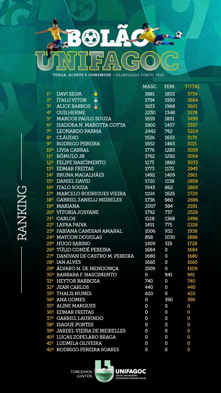 O ranking da 1ª fase do Bolão UNIFAGOC das Olimpíadas de Tóquio já está disponível. O resultado é a somatória de pontos de cada participante na fase de grupo das competições de Futebol Masculino e Feminino.