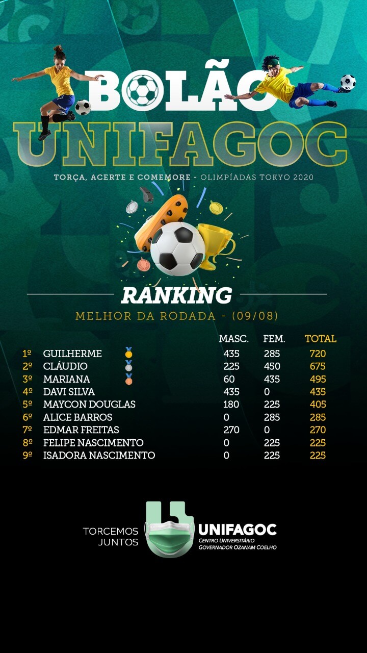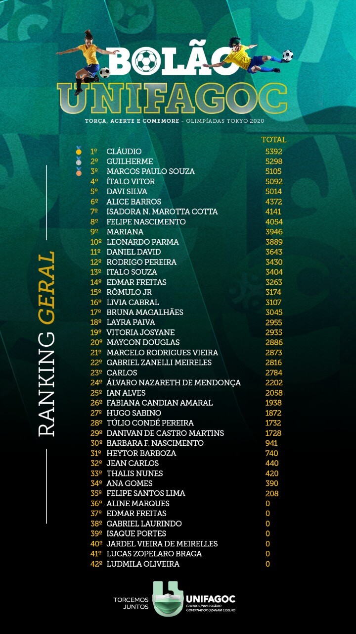 Chegou ao fim o Bolão UNIFAGOC das Olimpíadas de Tóquio referente aos campeonatos de Futebol Feminino e Masculino. Na última fase, foram considerados os palpites dos participantes nos jogos das finais e as disputas de terceiro lugar.