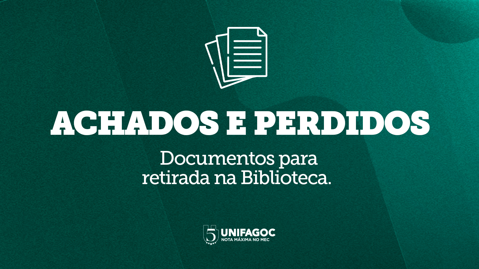 A Biblioteca Antônio Olinto, do UNIFAGOC, informa que os documentos pessoais perdidos nas dependências do campus estão disponíveis para a retirada no setor de achados e perdidos na Biblioteca Antônio Olinto.