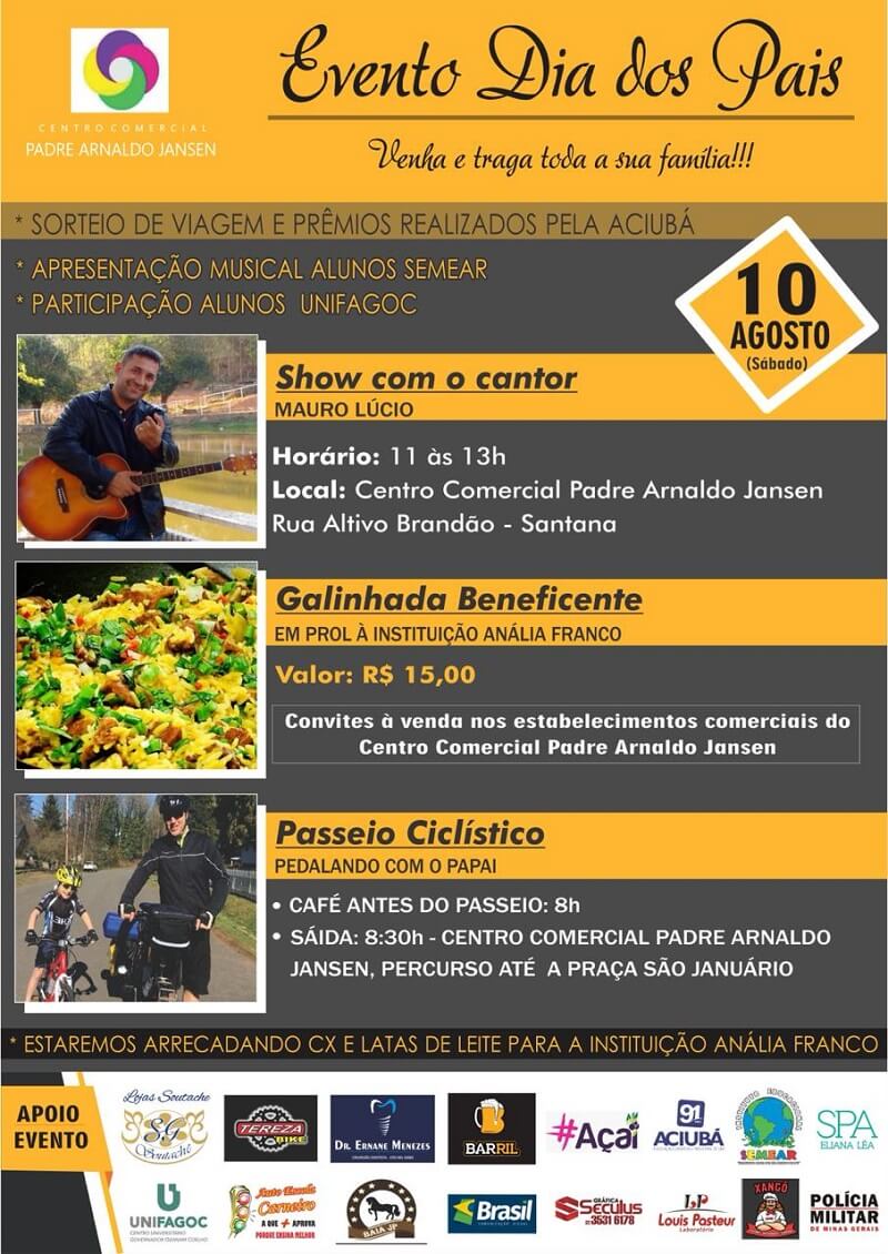 A ação terá início com o passeio ciclístico “Pedalando com o Papai”. Para o almoço, será servida uma galinhada e os interessados podem adquirir o convite, com valor de R$ 15, nos estabelecimentos do Centro Comercial. A renda será doada para a Instituição Anália Franco. Também serão arrecadadas caixas e latas de leite para a instituição.