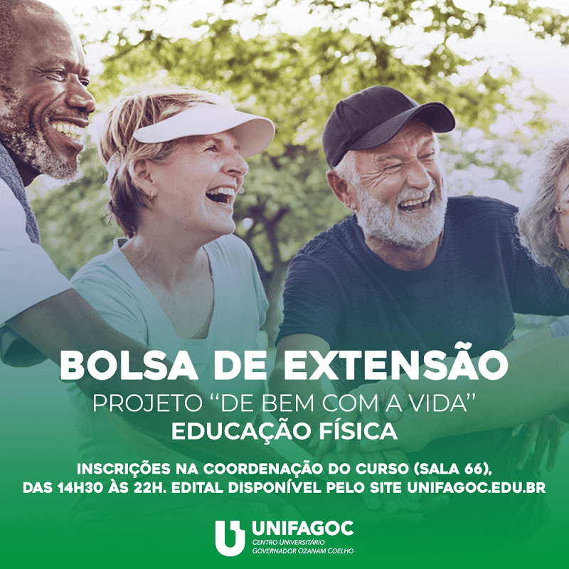 O curso de Educação Física Bacharelado do UNIFAGOC abre inscrições para o projeto "De Bem Com a Vida. São oferecidas oito bolsas de extensão no valor de R$ 100 cada. Confira o edital completo AQUI.