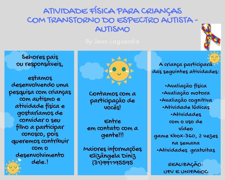 Os responsáveis por crianças com esse perfil que tenham o interesse de incluí-las na pesquisa pode entrar em contato com a professora responsável pelo projeto e diretora do curso de Educação Física do UNIFAGOC, Elizângela Diniz, pelo telefone (31) 99119-5595.
