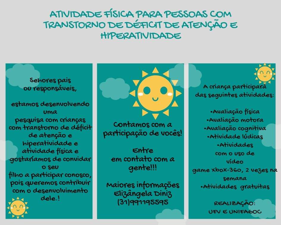 Atividade física para crianças com Transtorno do Espectro Autista (Autismo) ou com Transtorno de Déficit de Atenção e Hiperatividade (TDAH) é o tema do outro projeto de Iniciação Científica. Nesse caso, o curso está em busca de crianças que tenham algum desses diagnósticos para participar de avaliações motoras, física e cognitiva, além de atividades lúdicas e com vídeo game.