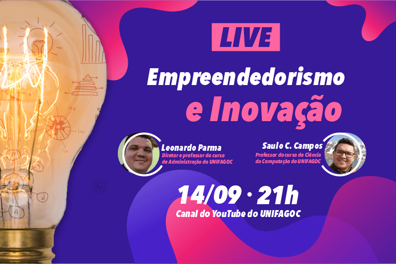 O Centro Universitário UNIFAGOC promove, nesta segunda feira (14), a live Empreendedorismo e Inovação. Para falar sobre o tema foram convidados o diretor do curso de Administração, Leonardo Parma e o professor do curso de Ciência da Computação, Saulo Cunha Campos.