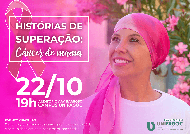 O curso de Enfermagem do UNIFAGOC promove, nesta terça-feira (22), o evento Histórias de Superação: Câncer de Mama em prol da Campanha Outubro Rosa, no Auditório Ary Barroso, às 19h. A iniciativa é destinada para alunos, pacientes, familiares e à toda a comunidade.
