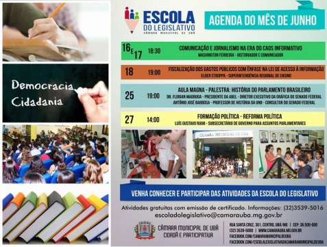 A Escola do Legislativo da Câmara Municipal de Ubá promove palestras e cursos em várias áreas de conhecimento. A programação do mês de junho conta com cursos na área de comunicação e palestras com temas sobre política. Nos dias 16 e 17 de maio, às 18h30, acontece o minicurso de Comunicação e Jornalismo na era do caos informativo que será ministrado pelo comunicador Washington Ferreira.