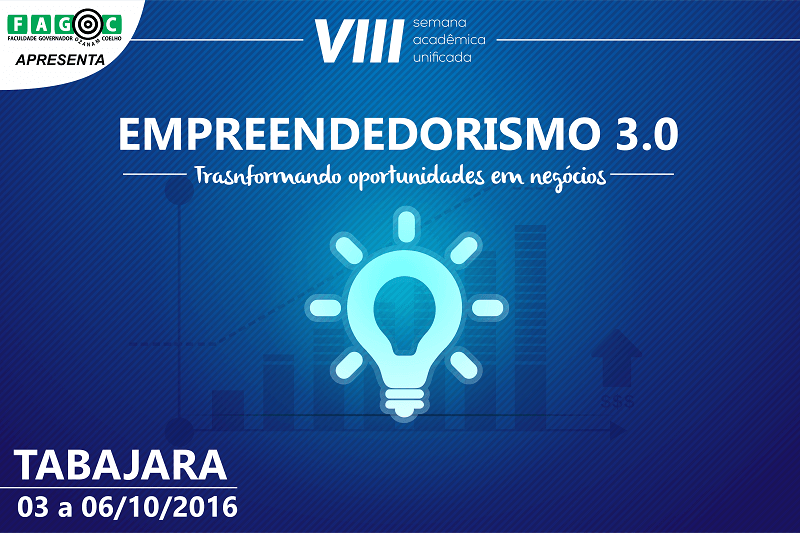 “Empreendedorismo 3.0” é o tema da VIII Semana Acadêmica Unificada Fagoc. Esta edição do evento tem o objetivo de fomentar o empreendedorismo entre alunos e professores, bem como promover a integração entre academia, comunidade e empresas da região. “Pela situação econômica global que vivemos, trata-se de um tema atual e que vai contribuir muito para a formação dos nossos alunos”, afirma o coordenador geral da iniciativa, Eraldo Teixeira.