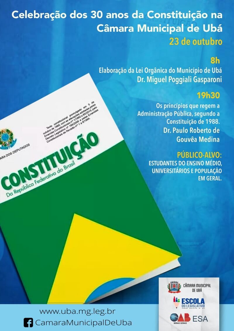 Acontece, na Câmara Municipal de Ubá, um evento em celebração aos 30 Anos da Constituição Federal Brasileira, nesta terça-feira (23). A programação começa às 08h com a palestra “Elaboração da Lei Orgânica do Município de Ubá”, ministrada pelo presidente da 30° Subseção de Ubá da Ordem dos Advogados do Brasil – (OAB/MG), doutor Miguel Poggiali Gasparoni.