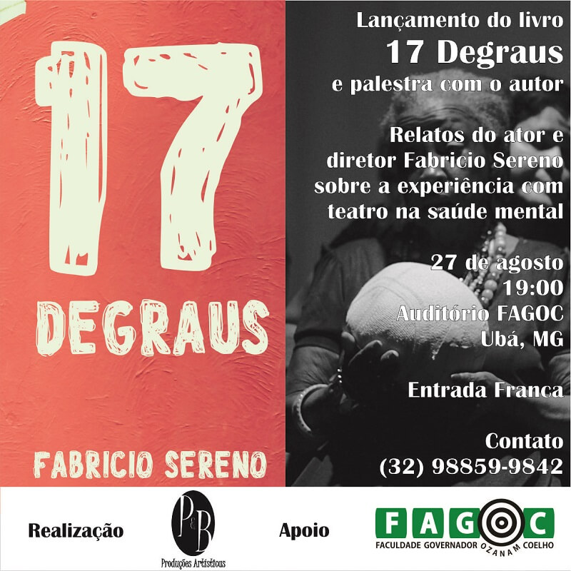 No dia 27 de agosto (segunda-feira), às 19h, o Auditório Ary Barroso da Fagoc recebe o lançamento do livro "17 Degraus". A obra é um relato do ator e diretor teatral Fabrício Sereno sobre o trabalho que desenvolve à frente da oficina teatral de reabilitação psicossocial dentro do Centro de Atenção Psicossocial Guida Sollero (CAPS), de Ubá. O evento é aberto ao público e a entrada franca.