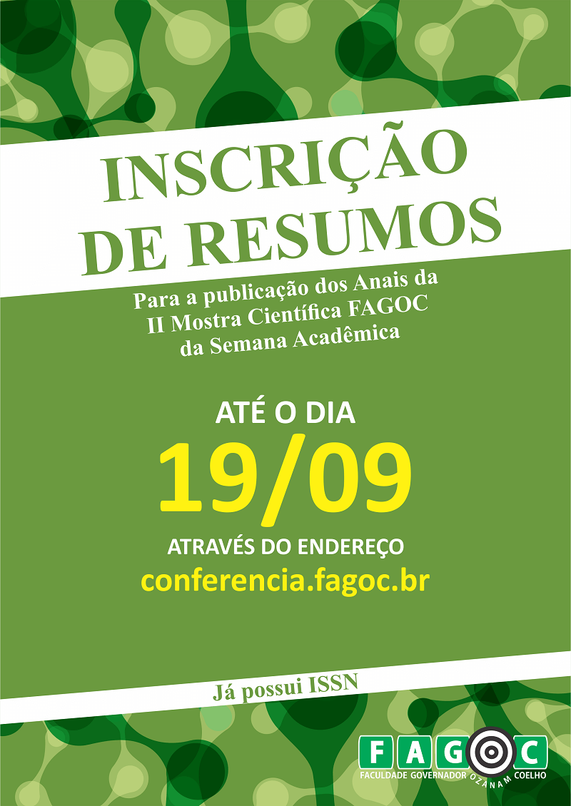 Já estão abertas as inscrições para submissão de Resumos Científicos para a publicação dos Anais da II Mostra Científica Fagoc da Semana Acadêmica.