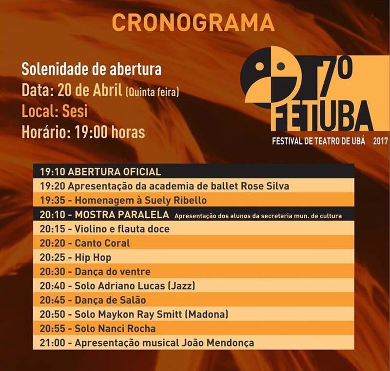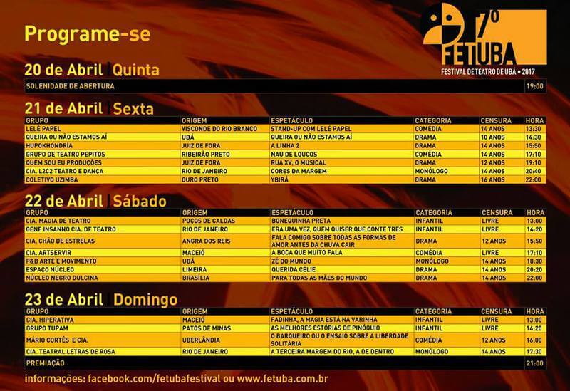 A cidade carinho recebe, a partir desta quarta-feira (20), o 7º Festival de Teatro de Ubá (FETUBA). O evento será realizado no Sesi e a entrada é gratuita para todos os públicos. A programação de peças teatrais se estende também durante a sexta (21), sábado (22) e domingo (23).