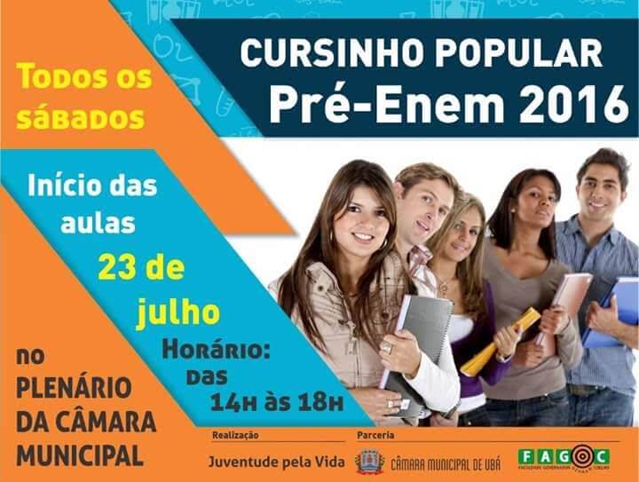 A Associação Juventude pela Vida, em parceria com a Fagoc, oferece Cursinho Popular Pré-Enem 2016. Com início previsto para o dia 23 de julho, as aulas serão realizadas aos sábados no horário das 14h às 18h, no Plenário da Câmara Municipal de Ubá. A iniciativa visa oferecer preparação gratuita e aprendizagem para os alunos da rede pública e privada de ensino da cidade que participarão do Exame Nacional do Ensino Médio deste ano.