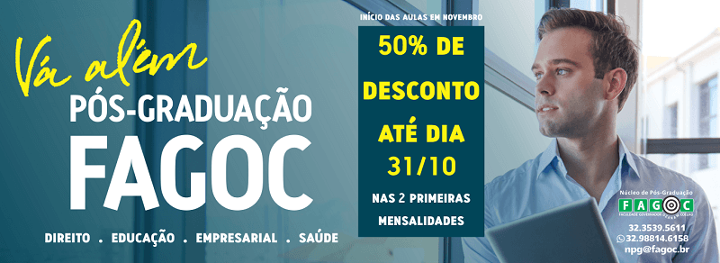 A Fagoc está com matrículas abertas para novas turmas de pós-graduação com previsão de início das aulas para novembro. São 14 cursos disponíveis em 4 diferentes áreas: Direito, Educação, Empresarial e Saúde.