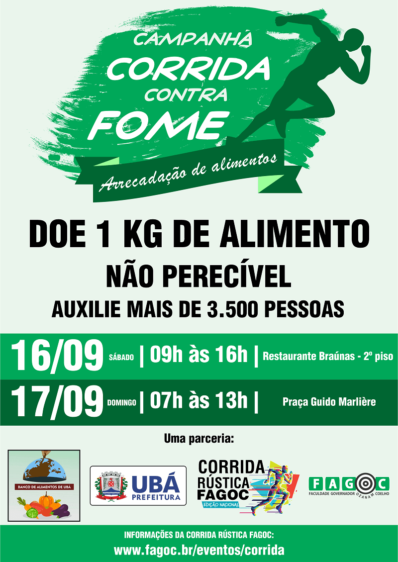 A Fagoc, representada pela Corrida Rústica, e a Prefeitura de Ubá, por meio do Banco de Alimentos, lançaram a Campanha “Corrida Contra a Fome”. A iniciativa tem por objetivo arrecadar alimentos não perecíveis, que serão direcionados pelo equipamento público para cerca de 3,5 mil pessoas em situação de vulnerabilidade social.