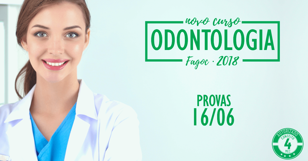 A Fagoc está com inscrições abertas para o Vestibular 2018-2. Entre os cursos disponíveis, a faculdade oferece a graduação em Odontologia, que abriu a primeira turma em março deste ano. O processo seletivo acontece no dia 16 de junho (sábado), às 14h, no Campus da instituição. As aulas começam em agosto.