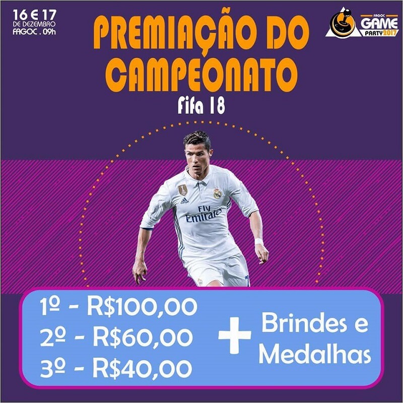 Já o Fifa 18 terá premiação de R$ 100 para o 1º lugar, R$ 60 para o 2º lugar e R$ 40 para o 3º lugar. Nesse jogo, a competição será individual.