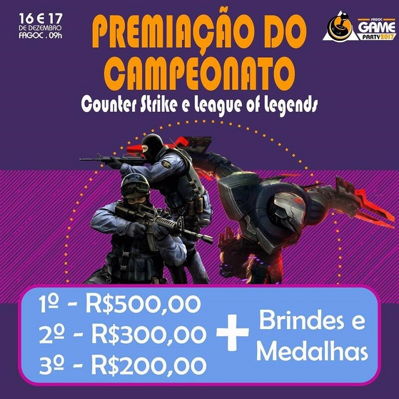 Os preparativos para o Fagoc Game Party 2017 já estão a todo vapor. Além da estrutura diferenciada com todas as salas climatizadas e ambiente preparado para cada game, a novidade da edição fica por conta da premiação em dinheiro para os vencedores dos tradicionais campeonatos de League of Legends, Counter Strike: Global Offensive e Fifa 18. A inscrição para as competições com premiação tem custo de R$ 20 e pode ser feita nos links disponibilizados mais abaixo.