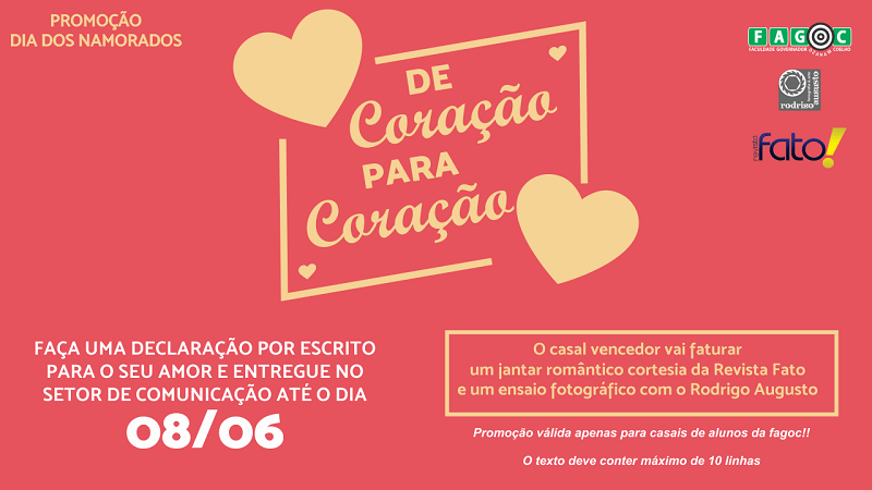 “De coração para coração”, esse é nome da promoção da Fagoc para o Dia dos Namorados. A campanha, divulgada nesta terça-feira (6), presenteará um casal de namorados, sendo que um deles deverá ser aluno da faculdade. Para participar, basta que esse aluno ou aluna escreva uma “cartinha bem romântica”, de no máximo 10 linhas, e a entregue no setor de Comunicação da Fagoc até quinta-feira (8).