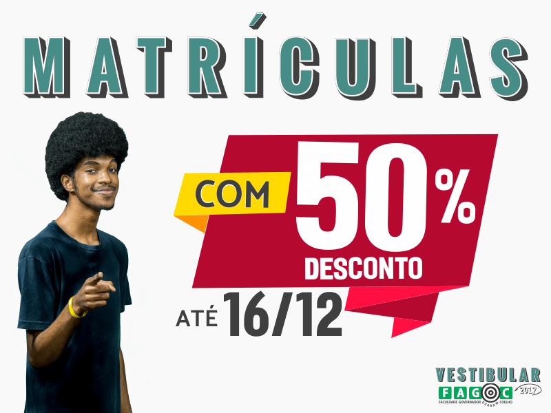 Os aprovados no Vestibular 2017 da Fagoc recebem, até essa sexta-feira (16), 50% de desconto na matrícula da graduação. Esse desconto é válido para todos os cursos ofertados no processo seletivo realizado no dia 3 de dezembro. Além disso, os candidatos que se matricularem dentro desse prazo recebem o mesmo desconto (50%) na rematrícula do segundo semestre de 2017.