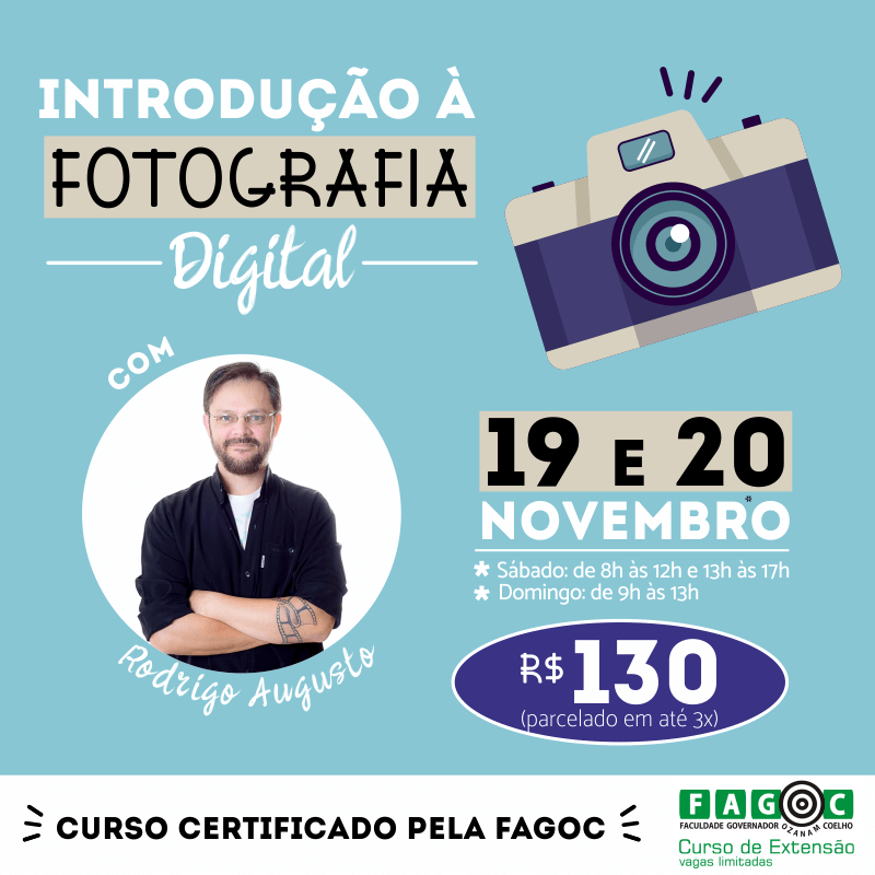 "Introduzir os participantes no mundo da fotografia de forma consciente, buscando mais qualidade nas fotos com o dispositivo que possui, independente de qual seja". Assim o fotógrafo Rodrigo Augusto define o objetivo do curso Introdução à Fotografia Digital, que vai ministrar nos próximos dias 19 e 20 de novembro no Campus da Fagoc.