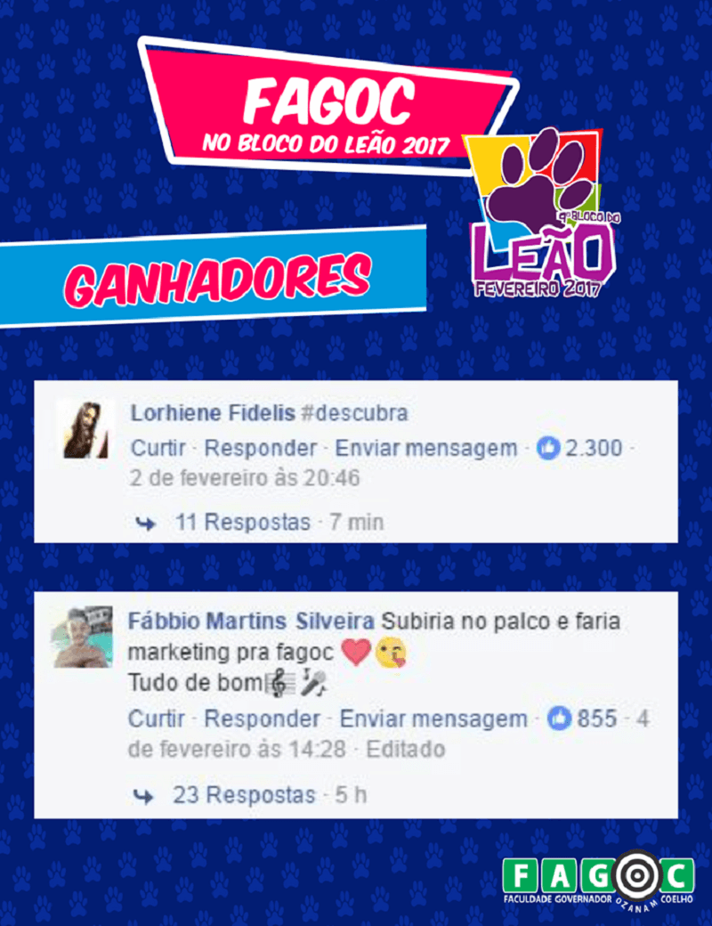Os comentários mais curtidos foram dos alunos Lorhiene Fidelis, do curso de Educação Física e Fábbio Martins Silveira, de Administração, que receberam um abadá camarote para o evento. "Amei! Valeu o sacrifício. Por isso eu amo a Fagoc, obrigado", agradeceu Fábbio que ganhou 855 curtidas dizendo que subiria no palco e faria marketing para Fagoc.