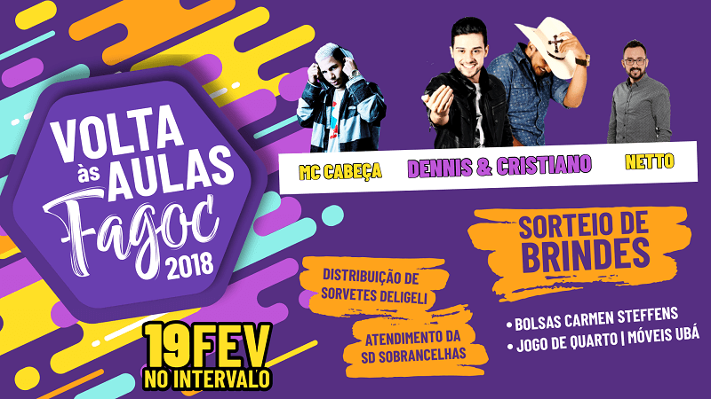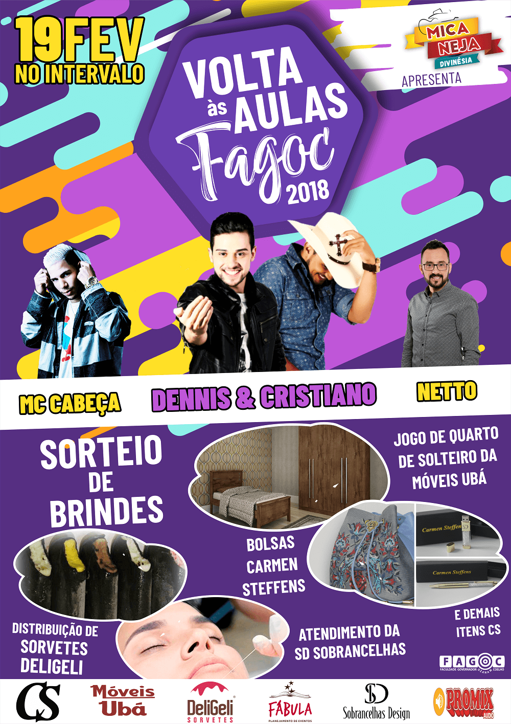 A equipe da festa Micaneja 2018, que será realizada em Divinésia no dia 10 de março, é a responsável pelas atrações musicais do Volta às Aulas Fagoc. Os alunos vão curtir o show principal da dupla sertaneja Dennis & Cristiano, com participação especial do Mc Cabeça e do cantor Netto.