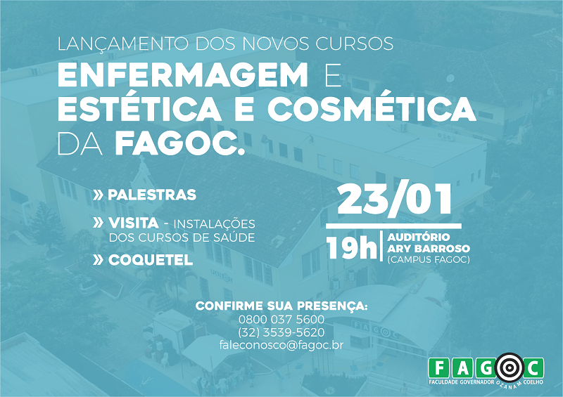 A Fagoc promove o evento de lançamento dos seus cursos de Enfermagem e Estética e Cosmética, no dia 23 de janeiro (quarta-feira). A iniciativa acontece no Auditório Ary Barroso, campus da faculdade, às 19h.