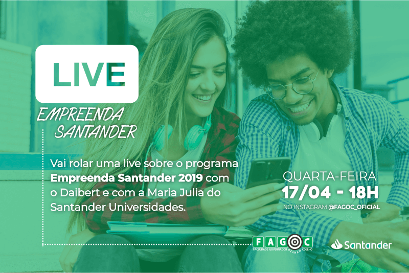 A Fagoc irá realizar uma live sobre o programa Empreenda Santander em seu Instagram, na próxima quarta-feira (17), às 18h. A ação tem o foco de apresentar o programa de empreendedorismo universitário e esclarecer as dúvidas dos alunos que desejam participar. A conversa será conduzida pelo superintendente acadêmico e de tecnologia da Fagoc, Marcelo Daibert e pela Maria Júlia Stockler, do Santander Universidades.