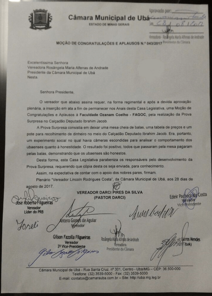 Na segunda-feira (28), a Câmara Municipal de Ubá, por requerimento do vereador Darci Pires (Pastor Darci), parabenizou a Fagoc pelo experimento social realizado no Calçadão Deputado Ibrahim Jacob.