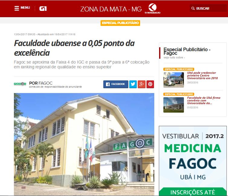 Na matéria do G1, veiculada no dia 13 de abril, pode-se verificar alguns gráficos que mostram que a Fagoc é "a melhor (faculdade particular) de Ubá e subindo no ranking regional".