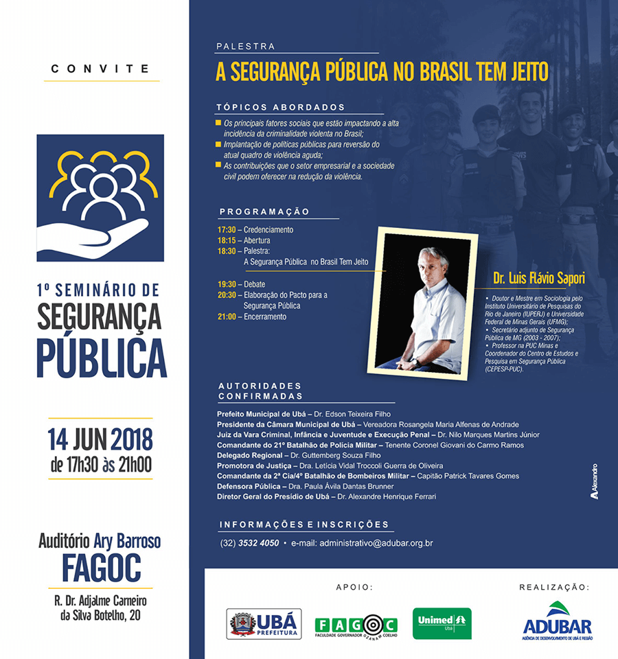 Além de debate e elaboração de pacto para a segurança pública, a programação do 1º Seminário de Segurança Pública conta com a palestra “A Segurança Pública no Brasil Tem Jeito”, que será ministrada pelo Dr. em Sociologia Luiz Flávio Sapori, às 18h30. As inscrições podem ser feitas pelo e-mail: administrativo@adubar.org.br.