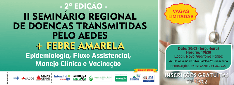 O novo auditório da Fagoc receberá, no dia 20 de fevereiro (terça-feira), às 19h30, a segunda edição do II Seminário de Doenças Transmitidas pelo Aedes + Febre Amarela. O evento promovido pelo curso de Medicina da Fagoc, por meio da Liga da Saúde, é destinado aos alunos de Medicina da instituição além de pessoas interessadas no assunto. Serão abordadas as temáticas Epidemiologia, Fluxo Assistencial, Manejo Clínico e Vacinação.
