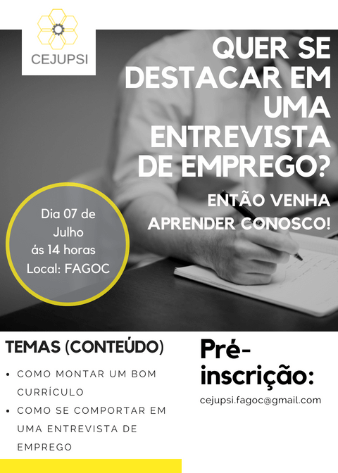 “Quer se destacar em uma entrevista de emprego?”, essa é a pergunta proposta pelo seminário que acontece no dia 7 de julho, às 14 horas, no auditório da Fagoc. Para fazer a pré-inscrição, o interessado deve enviar telefone e CPF para o e-mail cejupsi.fagoc@gmail.com. O evento é aberto para toda comunidade de forma gratuita.