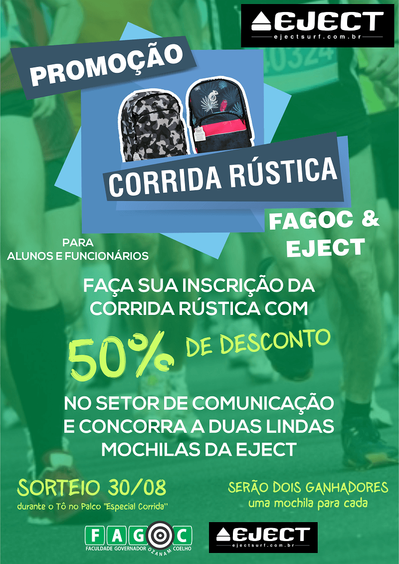 Os alunos e colaboradores da Fagoc que se inscreverem, até o dia 30 de agosto, na segunda edição da Corrida Rústica – edição nacional participarão do sorteio de duas mochilas da Eject, uma das patrocinadoras do evento. As inscrições, com 50% de desconto, podem ser feitas no setor de Comunicação da faculdade (sala 83).