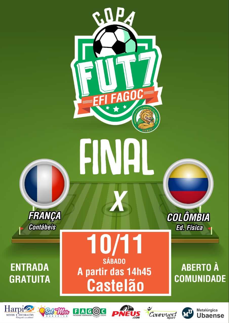 A Copa EFI Fagoc de Fut7 chega à partida final com a disputa entre os times França e Colômbia, compostos por alunos dos cursos de Ciências Contábeis e Educação Física, respectivamente. O jogo será realizado no dia 10 de novembro (sábado) a partir de 14h15, na Arena Castelão.