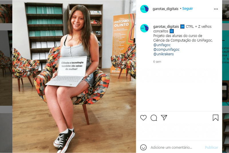 Reprodução de uma postagem do perfil no Instagram do projeto Garotas Digitais (www.instagram.com/garotas_digitais). Na foto, a estudante do primeiro período da Computação UNIFAGOC Milene Sena segura um notebook em que está escrito: "Ciência e Tecnologia também são coisas de mulher!".
