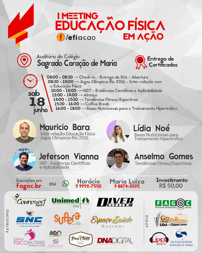 A Fagoc é uma das apoiadoras do I Meeting Educação Física em Ação, que será no dia 18 de junho (sábado) no Colégio Sagrado Coração de Maria. De acordo com a organização do evento, o objetivo é capacitar alunos e profissionais em Educação Física para inserção cada vez mais qualificada no mercado de trabalho. Os palestrantes serão os educadores físicos Mauricio Bara, Jeferson Vianna e Anselmo Gomes e a nutricionista Lídia Noé.
