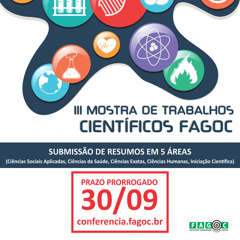 Estão abertas as inscrições para submissão de Resumos Científicos que serão publicados na III Mostra de Trabalhos Científicos Fagoc. As inscrições acontecem até o dia 30 de setembro e os projetos científicos selecionados serão apresentados durante a Semana Acadêmica da instituição, nos dias 8 e 9 de outubro.