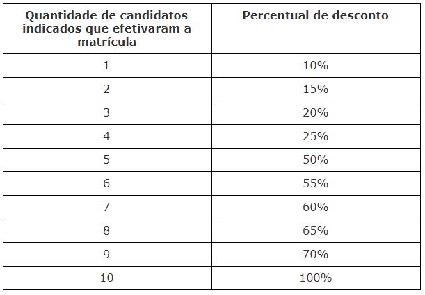 Quanto mais indicações, maior o desconto que aluno ganhará. O quadro abaixo apresenta a relação entre a quantidade de candidatos indicados que se matricularem e o percentual de desconto oferecido.