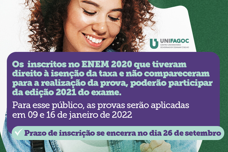 Os candidatos inscritos no Exame Nacional do Ensino Médio (ENEM) 2020, que tiveram direito à isenção da taxa e não compareceram para a realização da prova, aplicada nos dias 17 e 24 de janeiro, poderão participar da edição 2021 do exame. O prazo de inscrição para esses candidatos se encerra no dia 26 de setembro.