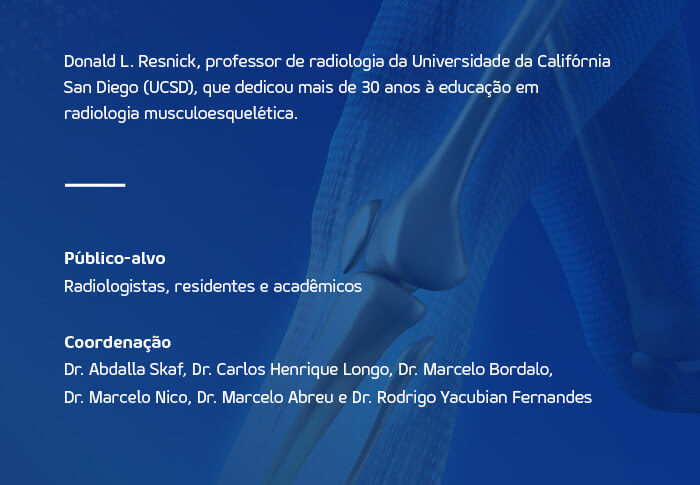 Estão abertas as inscrições para o Simpósio de Radiologia Musculoesquelética com o Dr. Resnick. O evento acontece no dia 15 de setembro, das 8h às 18h, em São Paulo, no Instituto Sírio-Libanês de Ensino e Pesquisa.