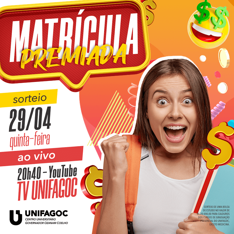 Nesta quinta-feira, 29 de abril, às 20h40, será transmitida no canal do Youtube TV UNIFAGOC a live de sorteio da Matrícula Premiada promovida pelo Centro Universitário. A promoção irá beneficiar um calouro do primeiro semestre de 2021 com uma bolsa de estudo no valor de 20 mil reais.