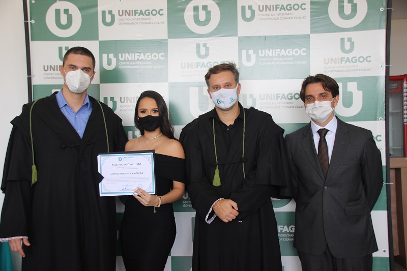 Na imagem, o diretor do curso de Medicina do UNIFAGOC, doutor Filipe de Andrade, a ex aluna Laryssa Mara Vieira Moreira, o médico e professor doutor José de Alencar e o vice-reitor da instituição Leonardo Couto.