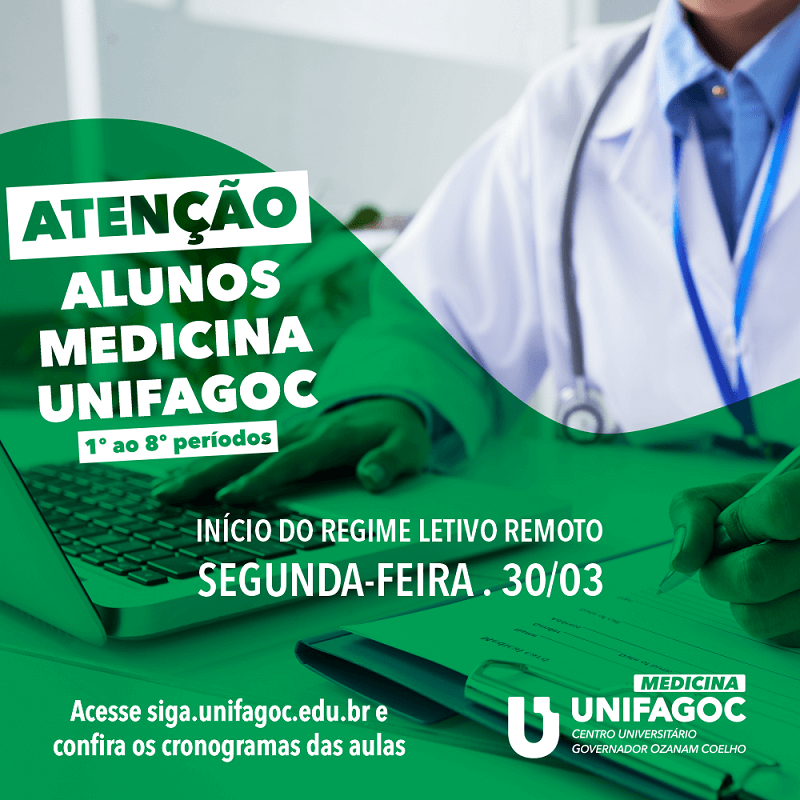 O Centro Universitário UNIFAGOC deu início, na última segunda-feira (30), ao Regime Letivo Remoto do curso de Medicina. A medida é subsidiada pela Portaria nº 345 do Ministério da Educação (MEC), publicada no dia 19 de março, no Diário Oficial da União, que autoriza a substituição das aulas presenciais pelas aulas remotas nas disciplinas teóricas-cognitivas do primeiro ao quarto ano do curso.