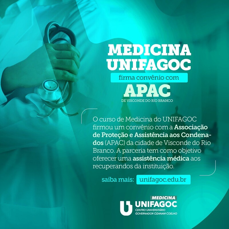 O curso de Medicina do UNIFAGOC firmou convênio com a Associação de Proteção e Assistência aos Condenados (APAC) da cidade de Visconde do Rio Branco. A parceria tem como objetivo oferecer uma assistência médica aos recuperandos da instituição.
