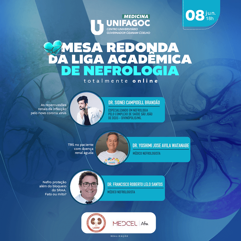 A primeira Mesa Redonda da Liga Acadêmica de Nefrologia Doutor Ricardo Furtado do curso de Medicina do UNIFAGOC já tem data marcada. O evento é gratuito e será realizado no dia 08 de junho (terça-feira), a partir das 18h no canal do Youtube TV UNIFAGOC.