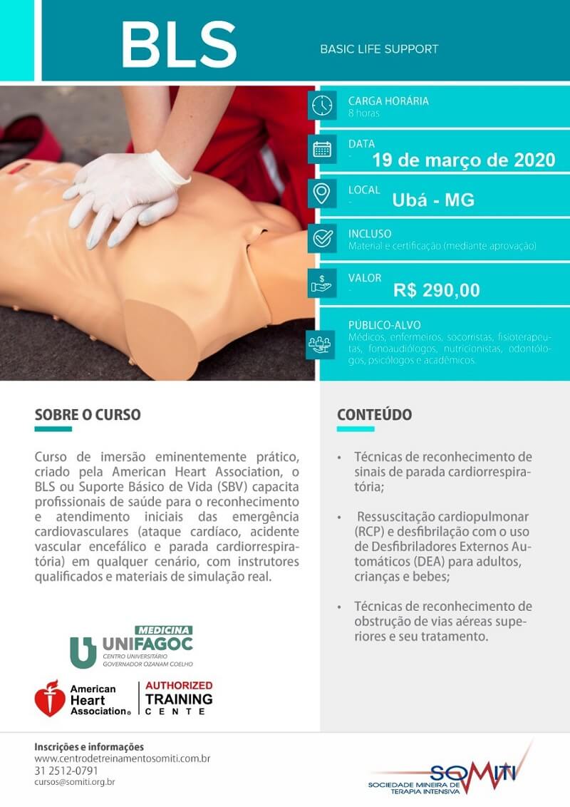 O curso de Medicina do UNIFAGOC e a Sociedade Mineira de Terapia Intensiva (SOMITI) promovem o treinamento Basic Life Support (BLS) de suporte básico da vida – curso oficial da American Heart Association (AHA). A iniciativa, que acontece no dia 19 de março (quinta-feira), possui carga horária de 08 horas e será ministrada por instrutores da SOMITI no campus do UNIFAGOC, localizado na Rua Dr. Adjalme da Silva Botelho, Bairro Seminário, Ubá (MG).