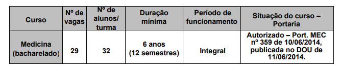 Além das 29 vagas disponíveis, três vagas serão ocupadas pelos candidatos contemplados com o Fundo de Financiamento Estudantil (FIES), para os que optarem por essa modalidade, e que se inscreverão pelo Sistema Informatizado do FIES (SisFIES) ou equivalente e deverão seguir as orientações publicadas pelo Ministério da Educação (MEC).