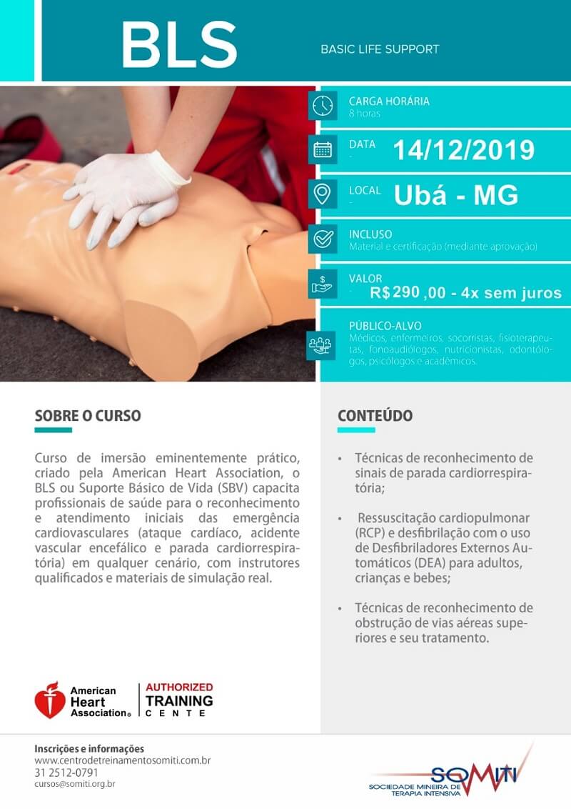 O curso de Medicina do UNIFAGOC e a Sociedade Mineira de Terapia Intensiva (SOMITI) promovem o treinamento Basic Life Support (BLS) de suporte básico da vida – curso oficial da American Heart Association (AHA). A iniciativa, que acontece no dia 14 de dezembro (sábado), possui carga horária de 08 horas e será ministrada por instrutores da SOMITI no campus do UNIFAGOC, localizado na Rua Dr. Adjalme da Silva Botelho, Bairro Seminário, Ubá (MG).